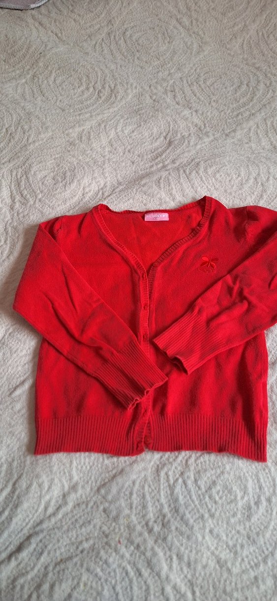 Kız çocuklar için uzun kollu, kırmızı renkli, triko kumaştan yapılmış, fitted kesim hırka. Düz ve sade tasarıma sahiptir, küçük nakış detayı bulunur.