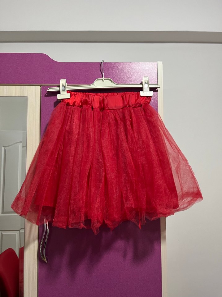 Bu kız çocuk etek, kırmızı renkte ve fırfırlı tasarıma sahip.