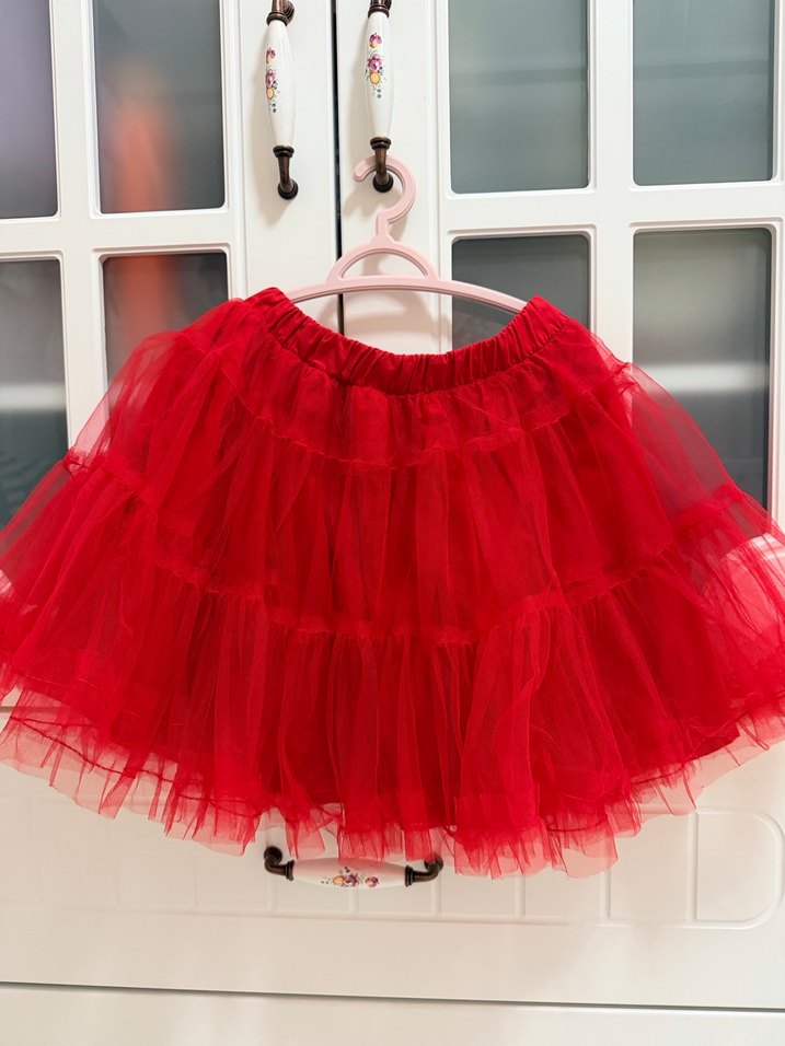 Sentetik kumaştan, kat kat fırfırlı, fitted kesim kız çocuk kırmızı etek. Canlı, tarzıyla öne çıkar.