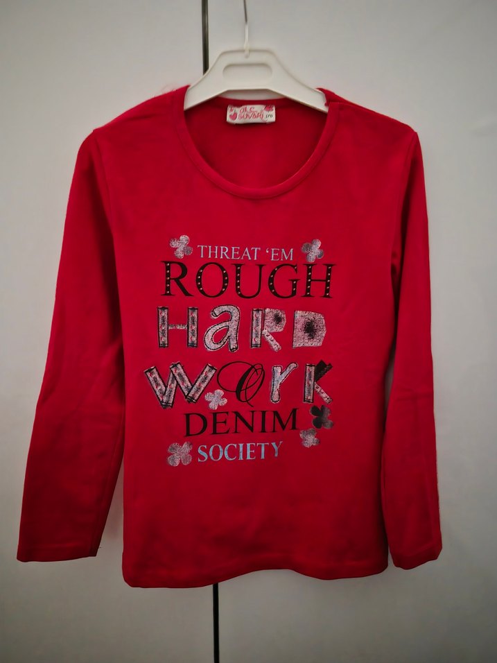 Kırmızı, uzun kollu ve dar kesim kız çocuk tişörtü, yuvarlak yaka ve renkli baskı detaylarına sahiptir. Yumuşak ve sıcak kumaştan üretilmiş, sokak stili sunar. Önde "DENIM, ROUGH, SOCIETY" yazıları ve çiçek süslemeleri bulunur.hic giyilmedi etiketi yok.176 beden yazıyor.