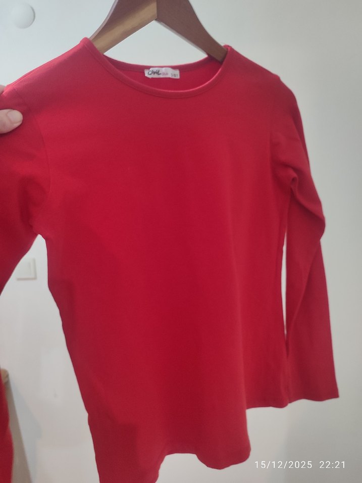 Kız çocuklar için uzun kollu, bisiklet yaka, kırmızı ve yumuşak, sıcak tutan kumaştan yapılmış, sokak tarzı uyumlu dar kesim tişört.