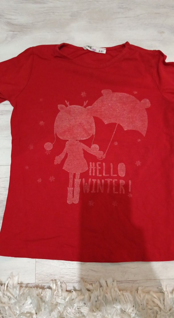 Kız çocukları için parlak kırmızı renkte, uzun kollu ve bisiklet yakalı tişört. Üzerinde şemsiye tutan kız ve 'HELLO, WINTER!' baskısı var. Yumuşak ve sıcak kumaştan yapılmıştır. ❄️