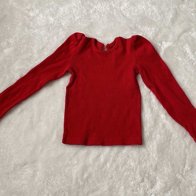 Kız çocukları için dar kesim, kırmızı uzun kollu ve yuvarlak yaka bluz. Yumuşak ve sıcak kumaştan, sade ve renkli tarzda.