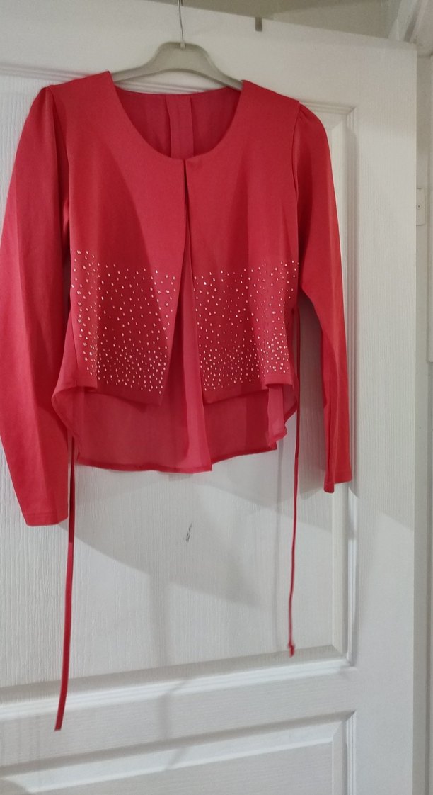 Kız çocuk kırmızı bolero, uzun kollu, yuvarlak yakalı ve bol kesimdir. Parlak sentetik kumaştan, önde süslemelidir. Modern tarz için uygundur. ✨