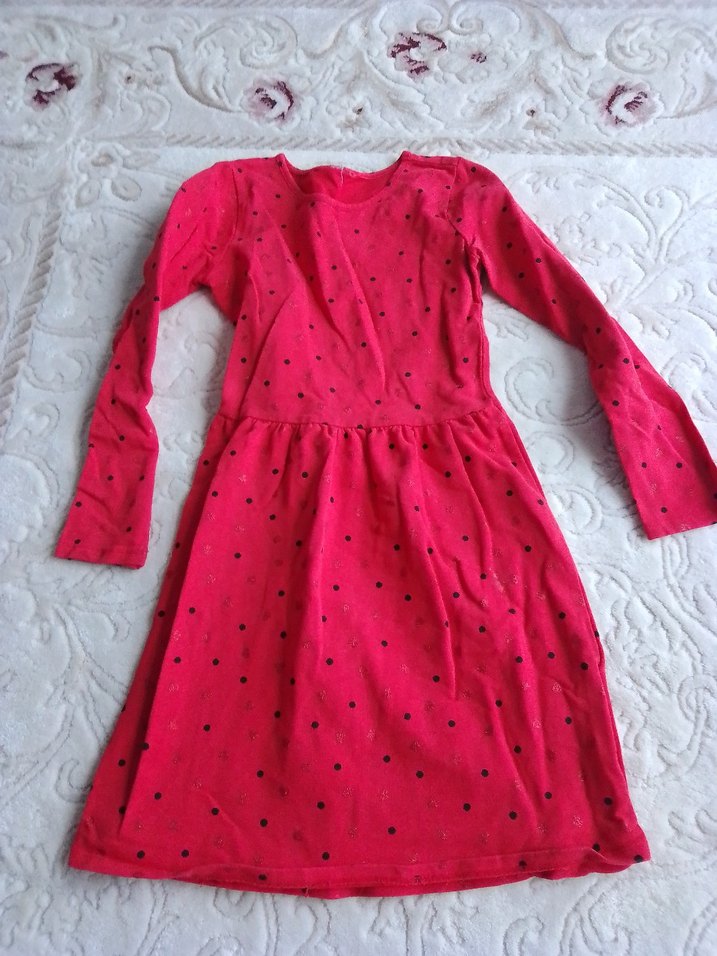 Yumuşak ve sıcak kumaştan üretilmiş, uzun kollu ve V yakalı, drapeli kırmızı kız çocuk elbisesi. Düz renkli, renkli ve küçük nokta detaylı.