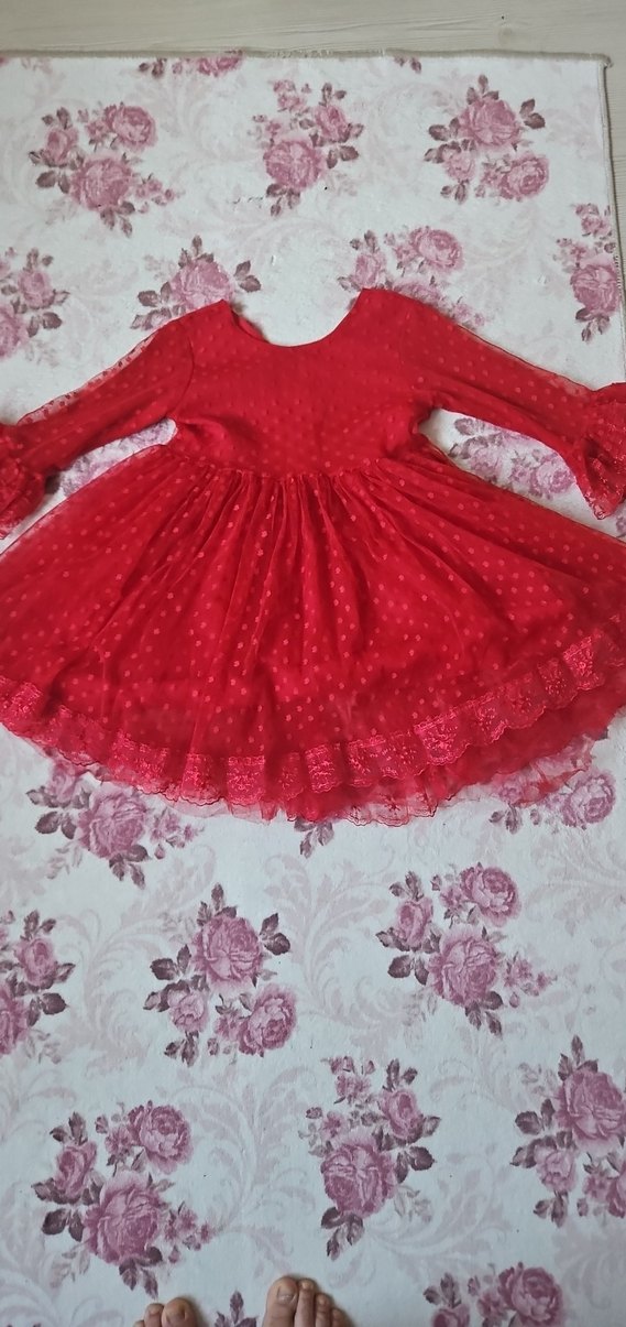 Kız çocuk için uzun kollu, yuvarlak yaka, fırfır detaylı kırmızı triko elbise, renkli ve bohem tarzda.7 yaş yazıyor ama 4 6 yaş için uygun ölçülerine göre alın