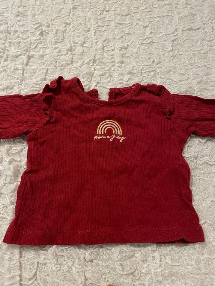Kırmızı, uzun kollu ve fırfırlı omuz detaylarına sahip, pamuklu kız çocuk tişörtü. Bohem tarzda, 'Have a play' yazılı gökkuşağı baskısı bulunur.