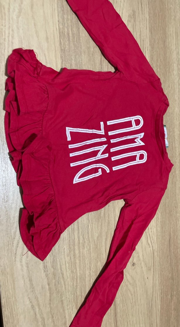 Kız çocuk kırmızı uzun kollu tişört, bol kesim ve fırfır detaylara sahiptir. Yumuşak ve sıcak kumaştan üretilmiş, renkli baskılı ve yuvarlak yakalıdır.