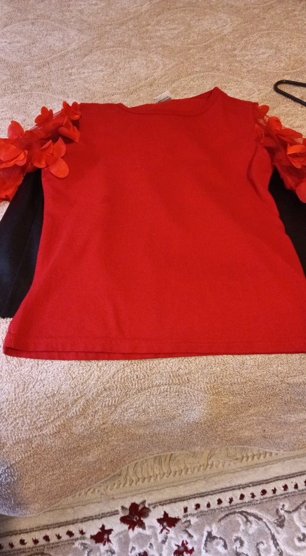 Kız çocuk için dar kesim, uzun kollu, fırfırlı detaylı, yuvarlak yakalı kırmızı tişört. Yumuşak sentetik kumaştan, sokak stili için uygun.
