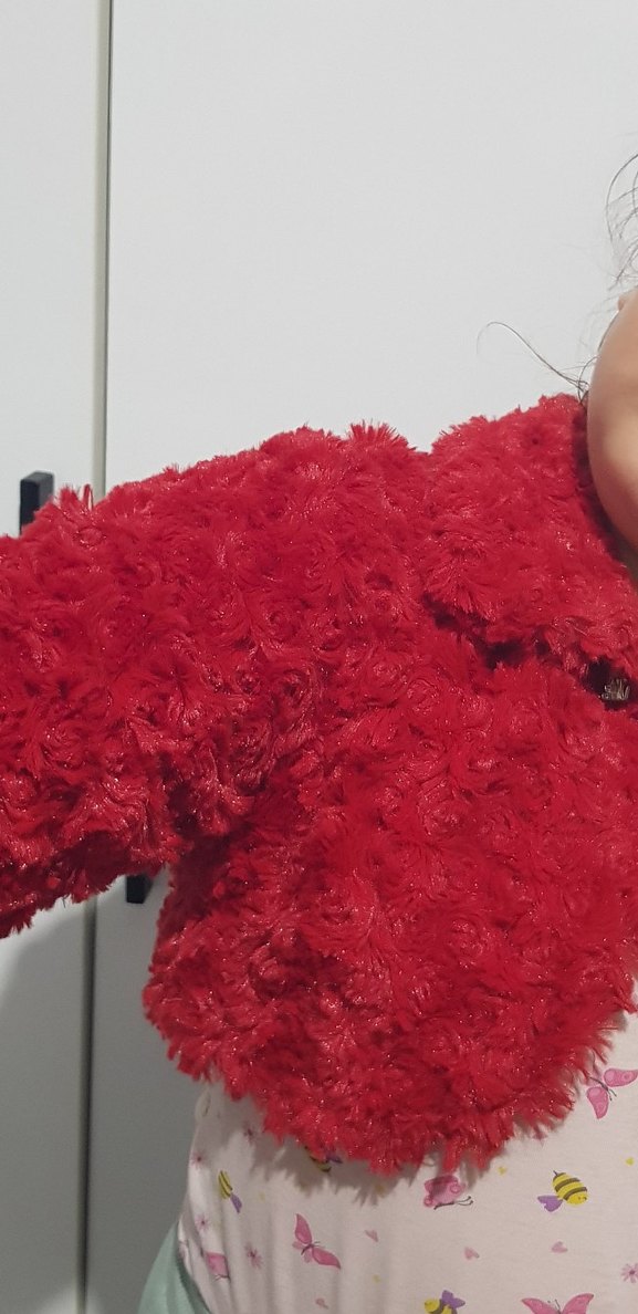 Kız çocukları için kırmızı renkli, uzun kollu ve yakali, bolero kesim, yumuşak ve sıcak dokulu kürk ❄️