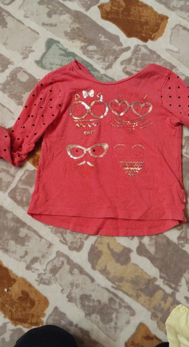 Kırmızı, uzun kollu kız çocuk tişörtü. Bol kesim, bisiklet yaka, payetli baskılı desenler ve puantiyeli kollarla renkli bir sokak stili sunar. Sentetik kumaştan yapılmıştır.