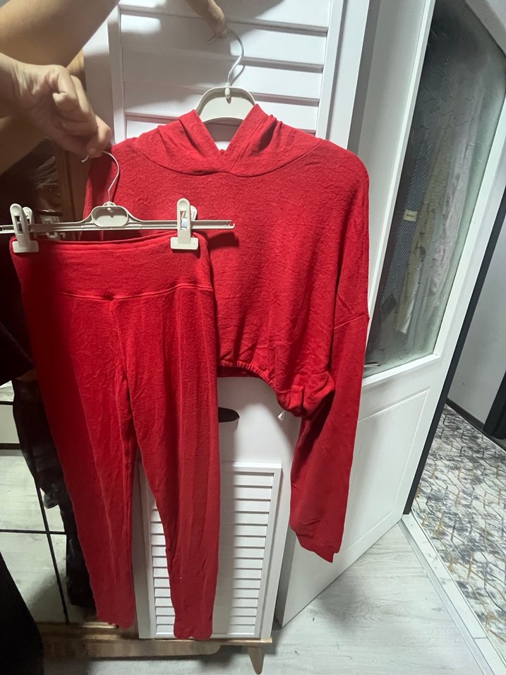 Kız çocuk kırmızı, uzun kollu, yüksek yakalı sweatshirt ve tayt takımı, yumuşak keten kumaştan, şık ve rahat bir sokak stili sunar.