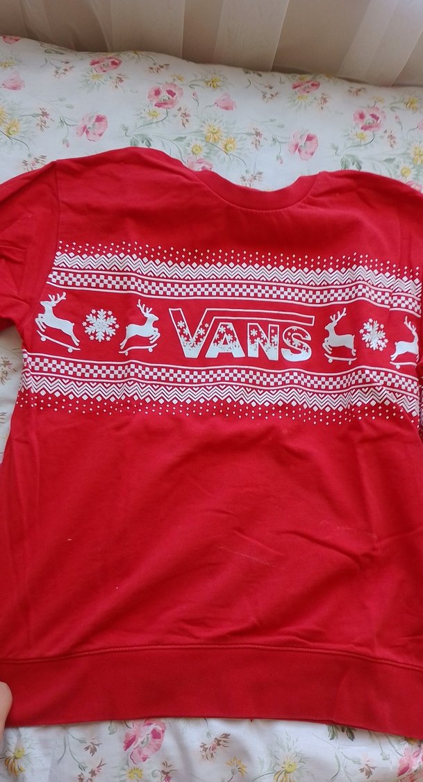 Kırmızı uzun kollu kız çocuk tişörtü, bol kesim ve V yakaya sahiptir. Vans logosu ve geyik desenli, yumuşak ve sıcak dokulu kumaştan yapılmıştır. ORİJİNALDİR BANA KÜÇÜK GELDİĞİ İÇİN SATIYORUM