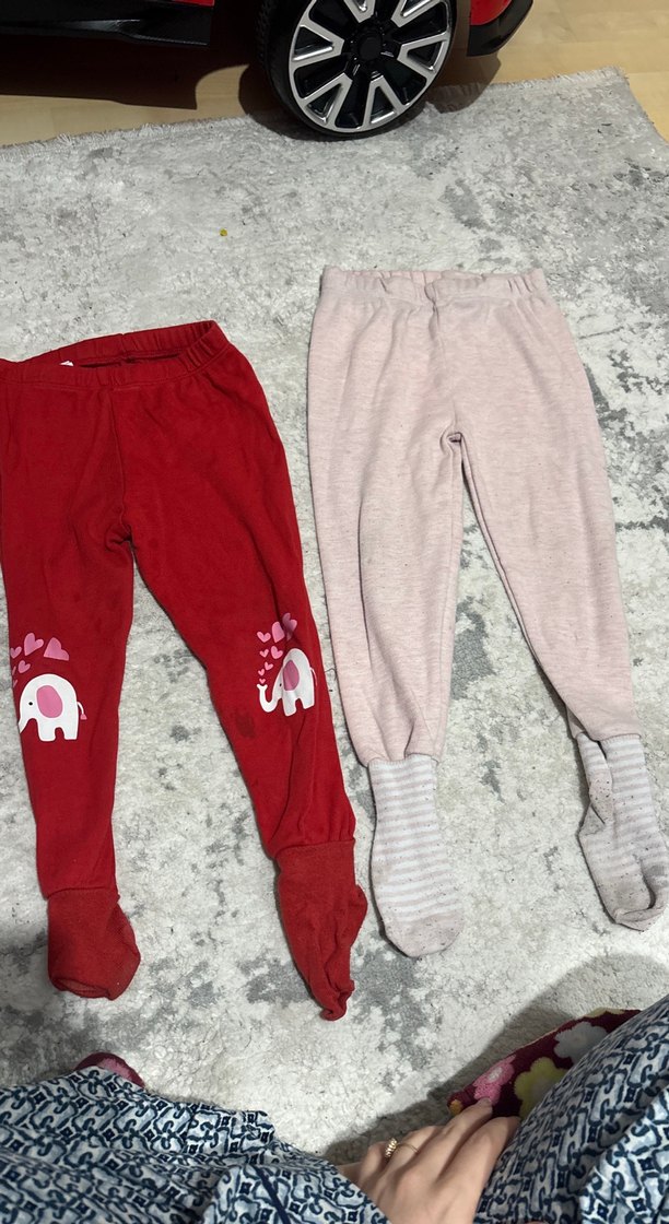 Kız çocuklar için kırmızı fil desenli ve açık gri çizgili ayaklı, elastik bel bantlı, fit kesim iki adet yumuşak tayt seti. İkisinin fiyatı