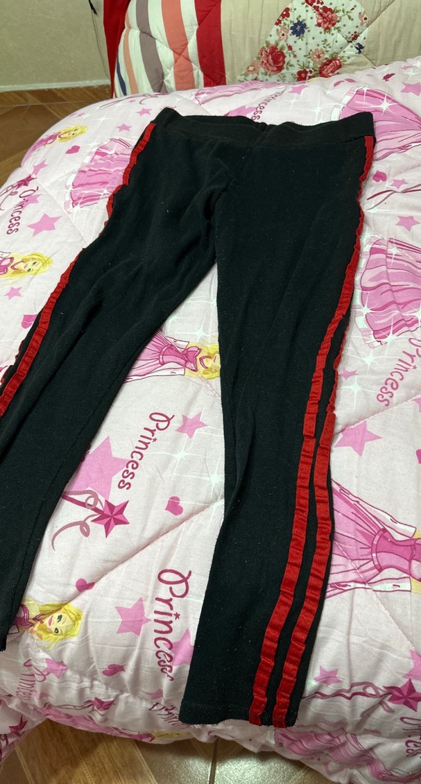 Kız çocukları için esnek sentetik kumaştan yapılmış, kırmızı yan şeritli siyah tayt. Rahatlık için lastikli beli vardır. Trend sokak giyimi için uygundur.