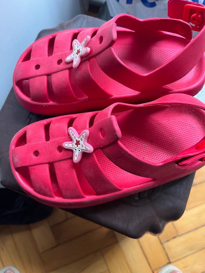 Kırmızı renkte, tokalı kız çocuk sandaletidir. Kauçuk malzemeden üretilmiş, renkli ve desensizdir. Yıldız şeklinde süsleme içerir.