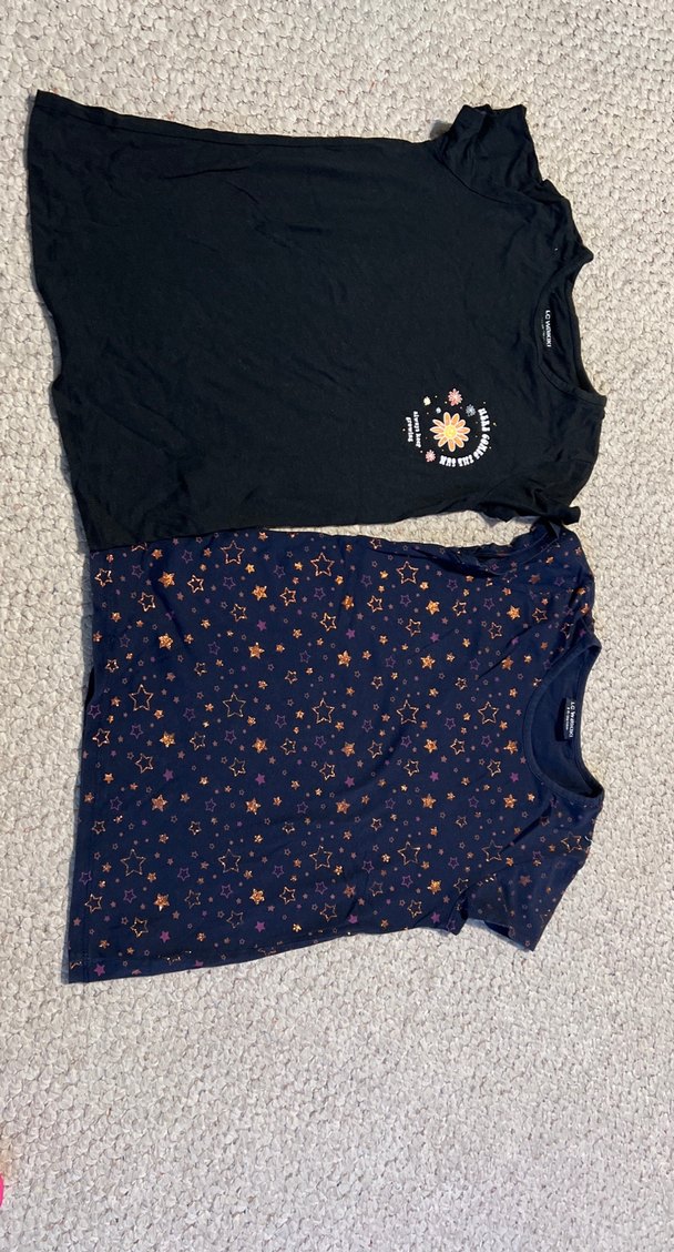 Bu set, kısa kollu ve bisiklet yaka, dar kesim iki kız çocuk tişörtü içerir. Biri küçük çiçek baskılı siyah, diğeri yıldız desenli koyu mavi. Yumuşak tekstil kumaşından.