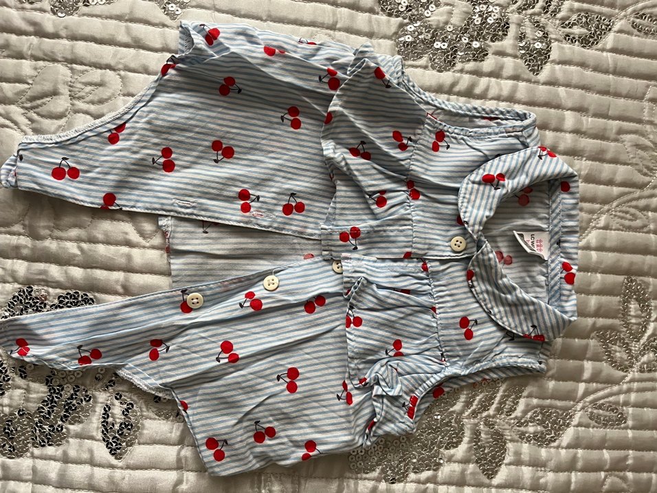 Kız çocuk gömlek, kısa kollu ve düğmeli, pamuklu kumaştan. Çilek desenli ve çizgili, bol kesim, rahat sokak stili için uygundur.