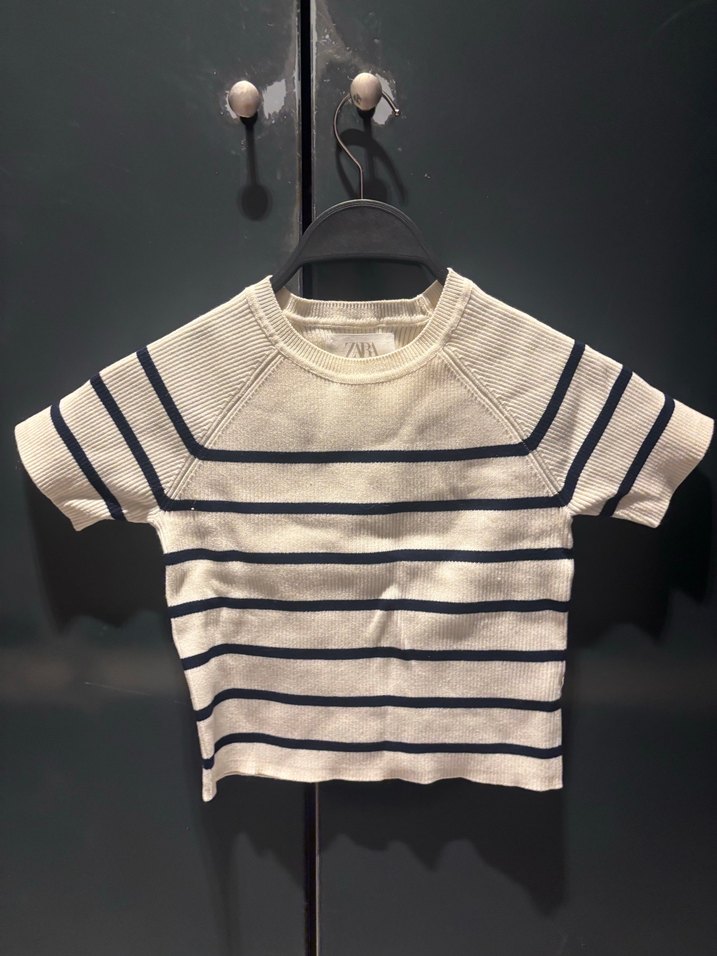 Kısa kollu, bisiklet yaka, beyaz ve gri çizgili, triko dokulu kız çocuk kazak. Trendy ve rahat stil için uygun.
