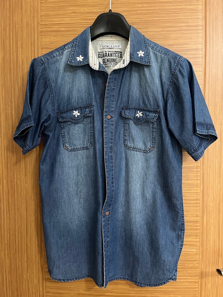 Parlak mavi denim kumaştan yapılmış, kısa kollu, regular fit kız çocuk gömleği. İki düğmeli cep ve kesik yakası ile trend sokak stili için uygun.