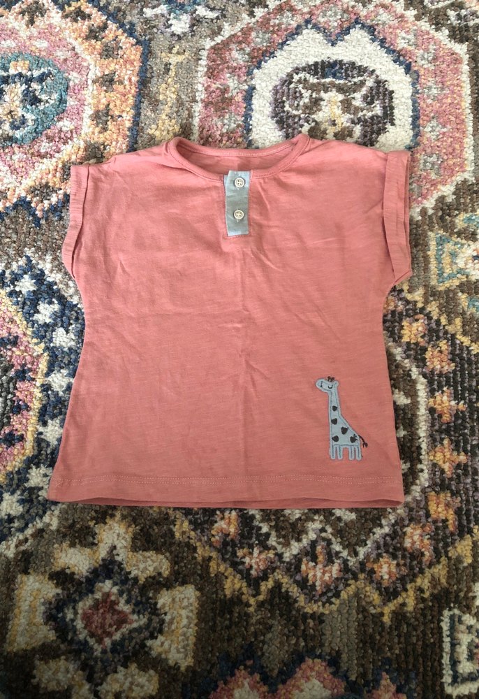 Kız çocukları için bol kesim, kısa kollu, yuvarlak yaka ve düğmeli tişört. Yumuşak tekstil kumaştan, pastel kahverengi tonunda, küçük zürafa baskılı, rahat sokak stili için uygun.