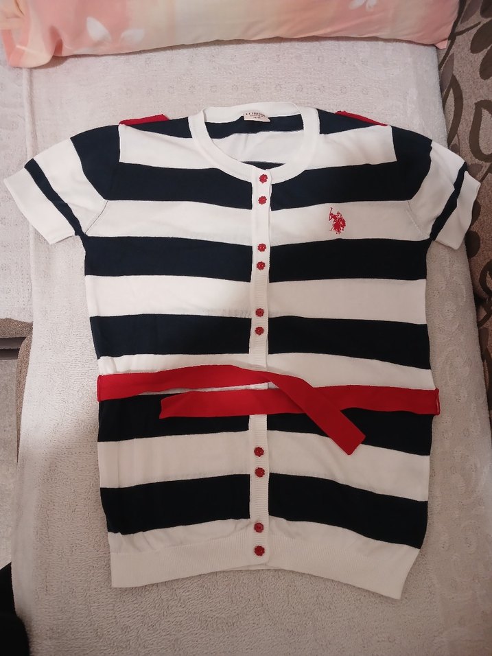 Pamuklu, kısa kollu ve düğmeli kız çocuk hırka. Beyaz-lacivert çizgili, kırmızı kemerli. Uspa markasına aittir