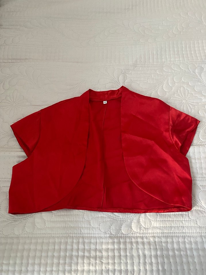 Kız çocuk için parlak kırmızı renkte, kısa kollu ve düğmeli bolero. Salaş kesimi ve yuvarlak yakasıyla sokak stili için uygundur.✨