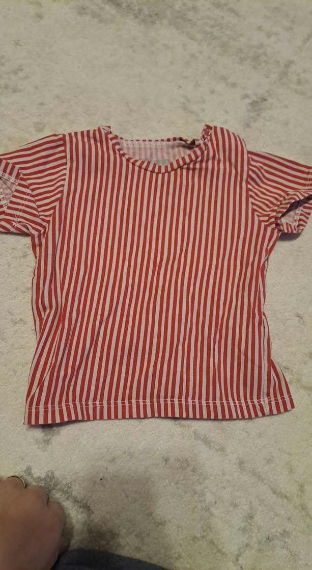 Kısa kollu, boğaz kesimli ve pileli detaylı kız çocuk tişörtü. Kırmızı beyaz çizgili desenli, tekstil malzemeden, sokak stiline uygun.