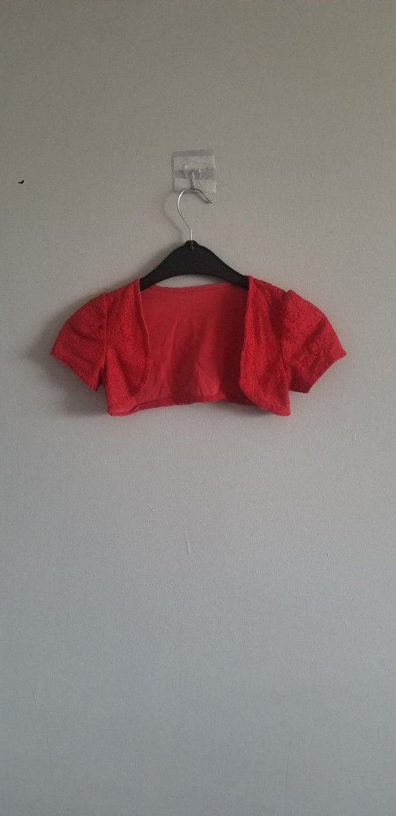 Kısa kollu, straplez yakalı kız çocuk bolero. Keten kumaş ve parlak kırmızı dantel detaylı, bohem ve retro tarzına uygun. hiç giyilmedi