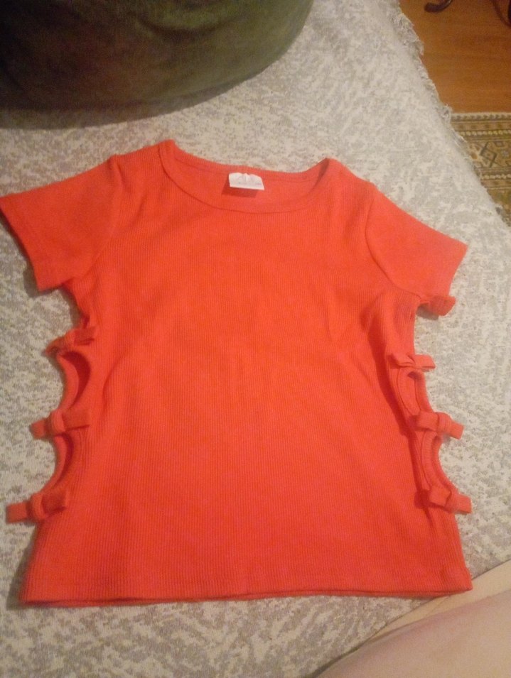 Kısa kollu, yuvarlak yakalı kırmızı kız çocuk tişörtü, yanlarda fırfır detaylıdır. Düz, renkli ve sentetik kumaştan yapılmıştır.