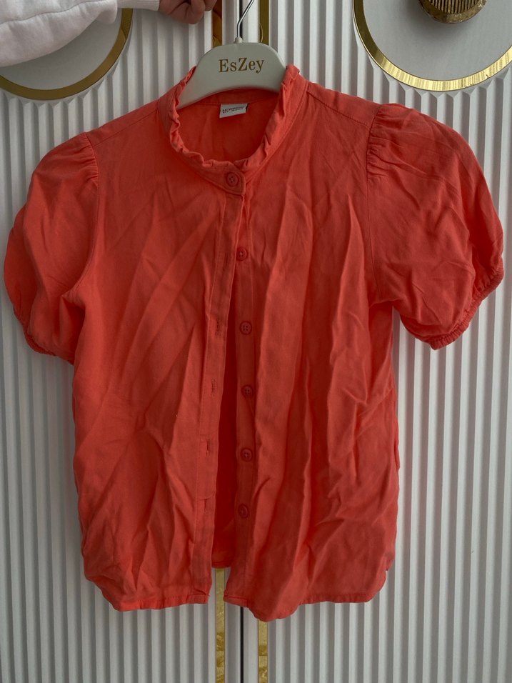 Kız çocuklar için keten kumaştan, kısa kollu, düğmeli ve yakalı, bol kesim kırmızı pastel renk bluz. EsZey markasına ait, sokak stiline uygun rahat bir parça.