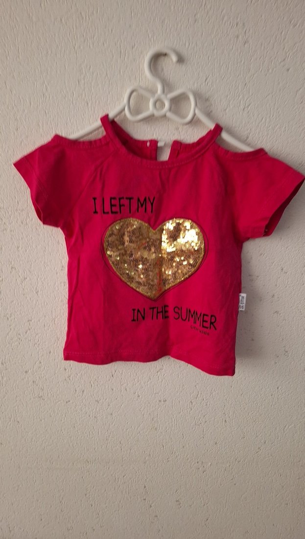 Kısa kollu, dar kesim kırmızı kız çocuk tişörtü. Önünde simli altın kalp ve "I LEFT MY IN THE SUMMER" yazısı bulunan renkli baskı vardır. Street wear tarzı, sentetik kumaş.