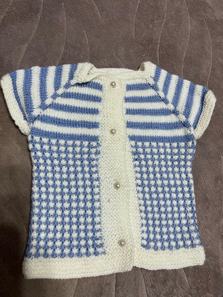 Kısa kollu, örgü kız çocuk hırka. Beyaz ve mavi çizgili ve dokulu desenlerle, inci düğmeli ve yumuşak örgü kumaştan yapılmıştır. El örgüsüdür