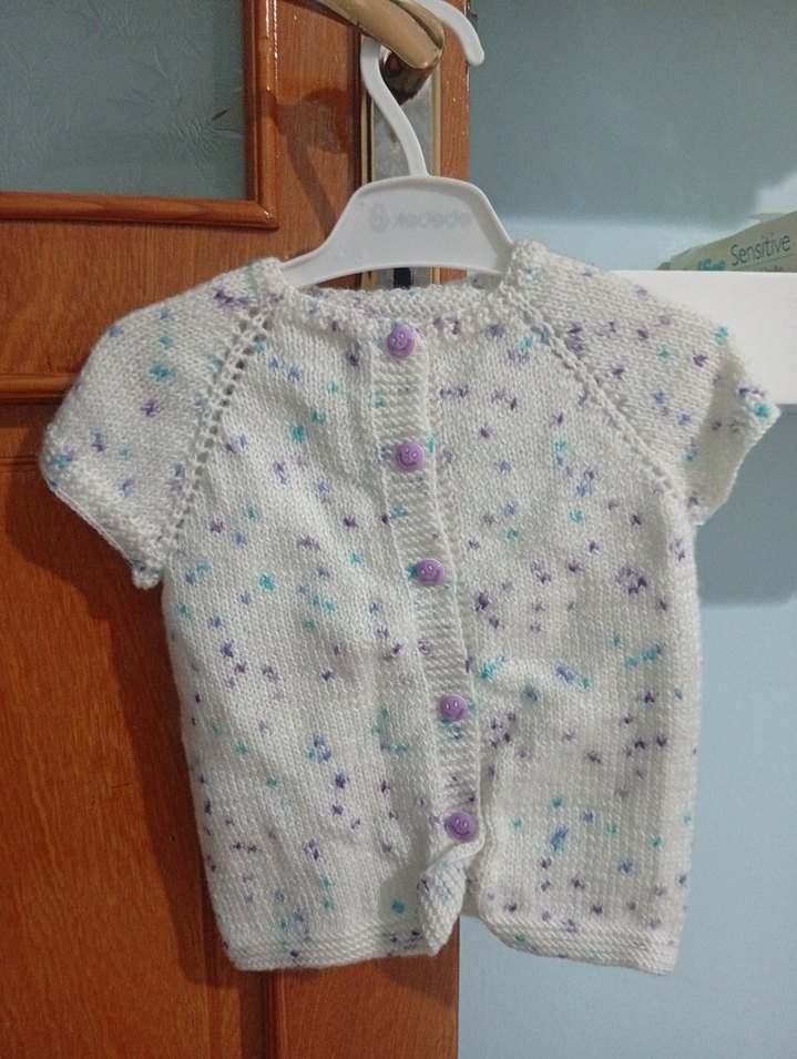 Pastel beyaz renkli, kısa kollu, bol kesim örgü kız çocuk hırkası, küçük pastel renkli noktalar ve mor düğmelerle süslenmiştir. yesyenı tertemızdır hıc kullanımladı