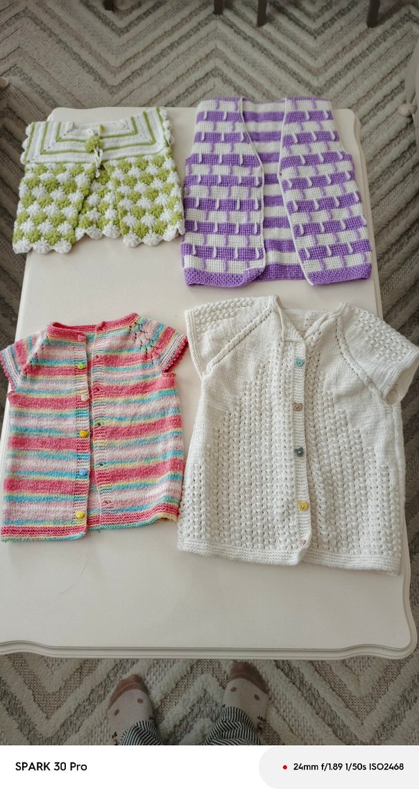 Kız çocukları için kısa kollu, bol kesim örgü hırkalar. Açık renklerde, sade ve renkli tasarımlara sahip. Rahat ve gündelik tarz. yeşil ve mor bir ıkı kez kullanıldı sorunsuz lar. diğerleri de az kullanıldı 6-9-12 aylar #yelek #hırka