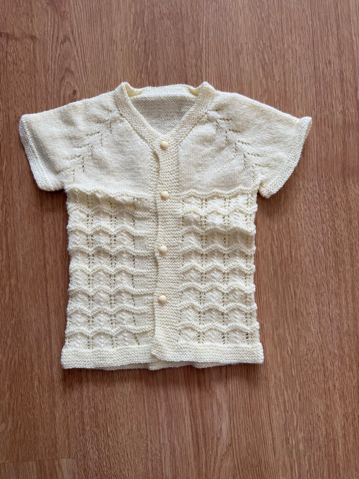 Kısa kollu, fitted vintage tarzda kız çocuk örgü hırka. Düğmeli ve alt kısmı zarif desenli, pastel beyaz renkte.