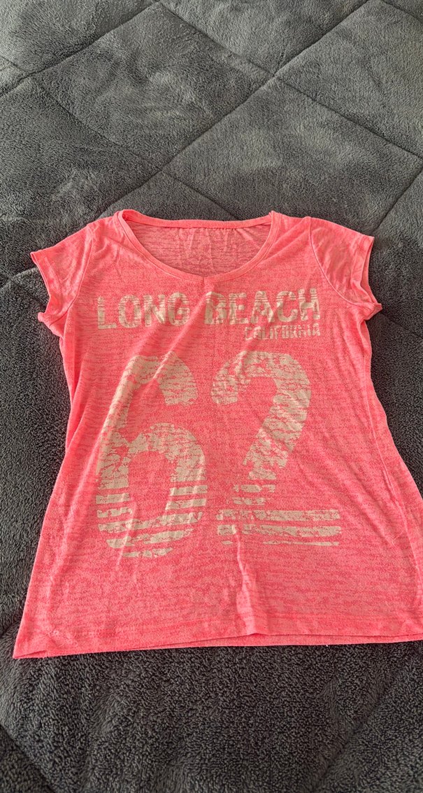 Kız çocuk tişörtü, kısa kollu ve yuvarlak yakalıdır. Hafif pembe keten kumaştan olup, bol kesim ve baskılı desene sahiptir. Sokak stiline uygun rahat bir parçadır.
