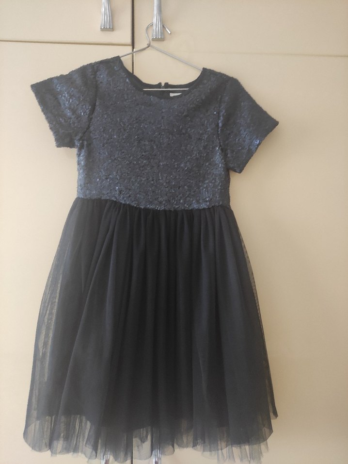 Kız çocukları için kısa kollu, yuvarlak yakalı, parlak sentetik kumaştan üst kısmı ve siyah tül etekli, loose fit elbise. Gotik tarzda klasik şıklık sunar. ✨