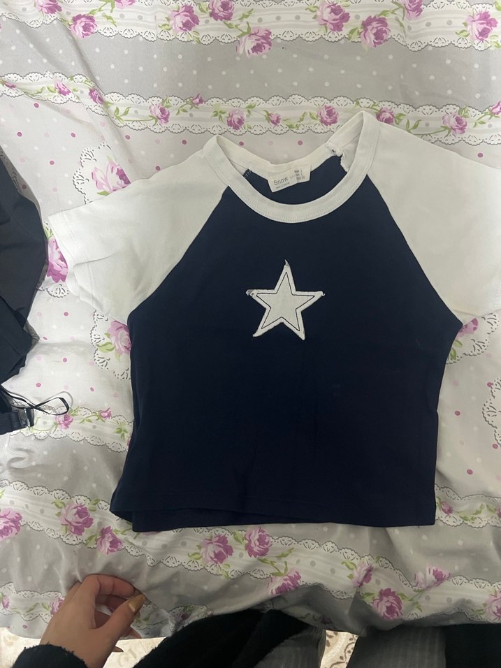 Kısa kollu, bisiklet yaka ve oturan kesime sahip kız çocuk tişörtü. Önünde yıldız baskısı ve beyaz kollar bulunur, yumuşak sentetik kumaştan üretilmiştir. ⭐