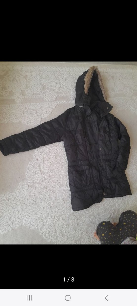 Siyah, kürklü kapüşonlu, rengi iyi sadece sapka kenarı sökük dikilir.ince sma iş görüyor. Desensiz, rahat sokak stili için uygun.