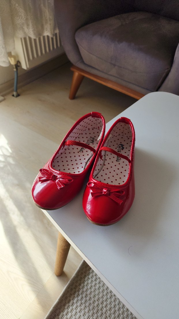 Kız çocuklar için kırmızı, fiyonklu babetler. Düz yüzeyli, renkli ve klasik tarzda kauçuk malzemeden üretilmiştir. 1 defa giyildi