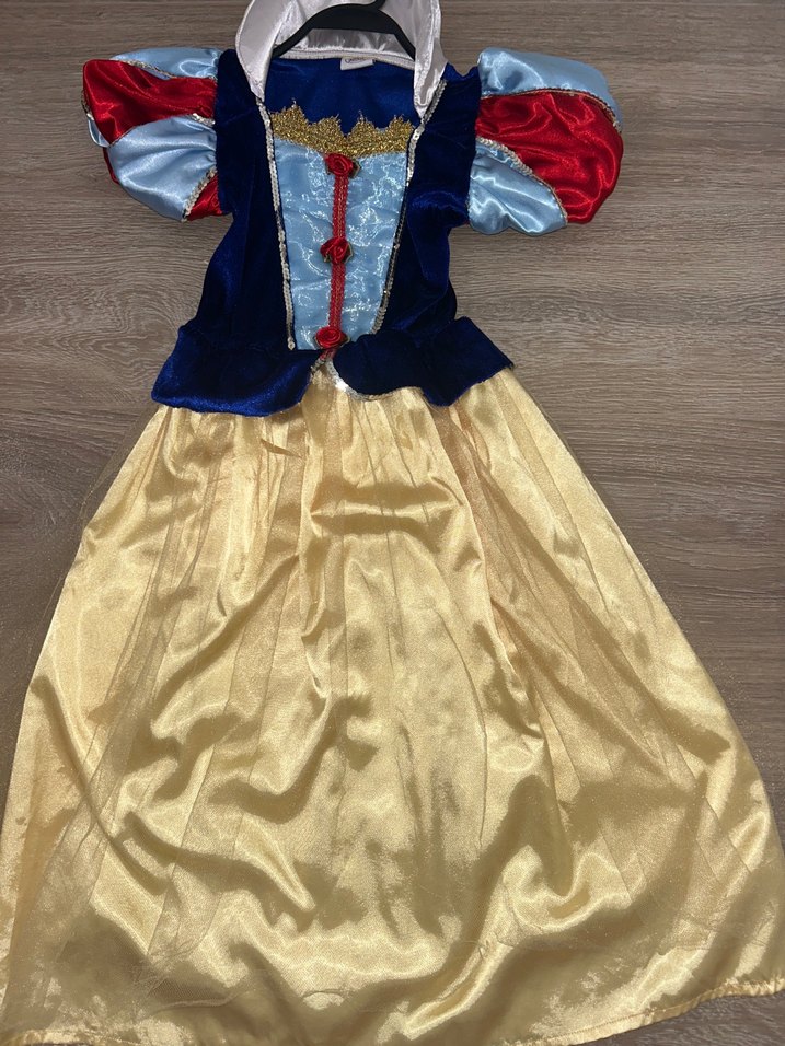 Kız çocuk klasik prenses kostümü, parlak ve drapeli etek, nakışlı straplez üst ve canlı renklerde kollar içerir. Defosu yoktur.Bir kez giyildi