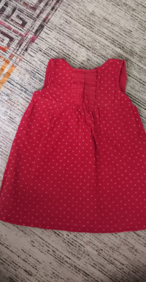 Kolsuz, V yakalı, fırfır detaylı kırmızı kız çocuk elbisesi. Yumuşak kumaştan, bol kesim ve sade bohem tarzda.