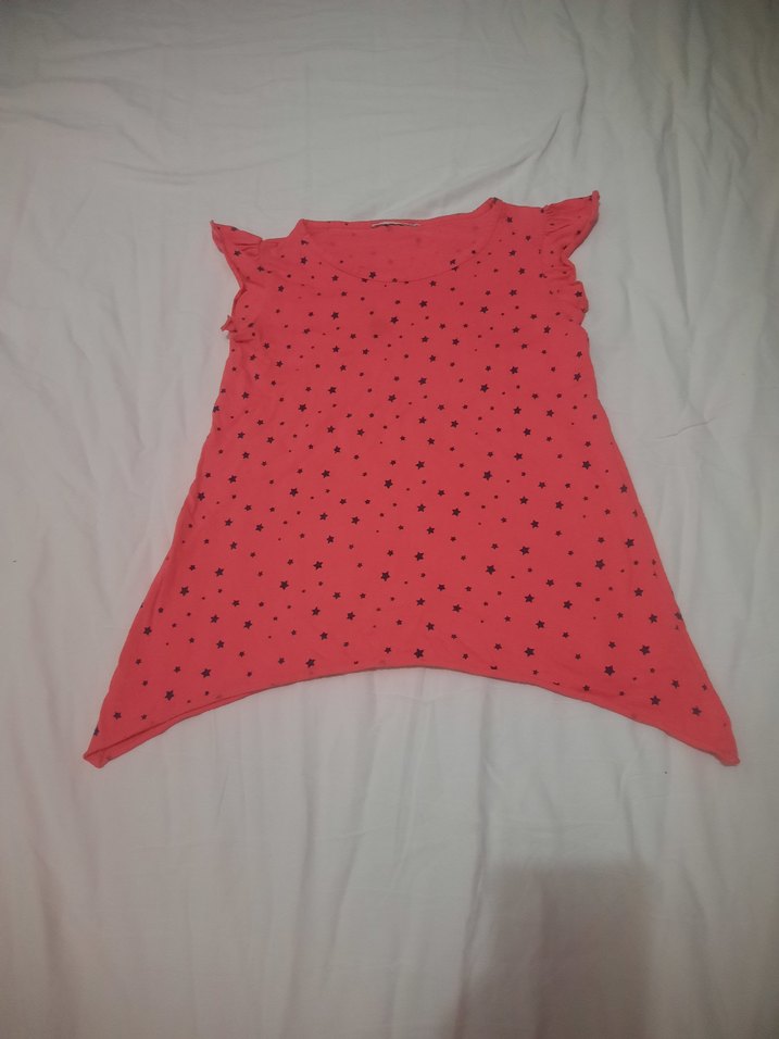Kız çocukları için kolsuz, kayık yakalı ve fırfırlı detaylı bluz. Renkli kırmızı ve yıldız desenli, sentetik kumaştan, bol kesim.
