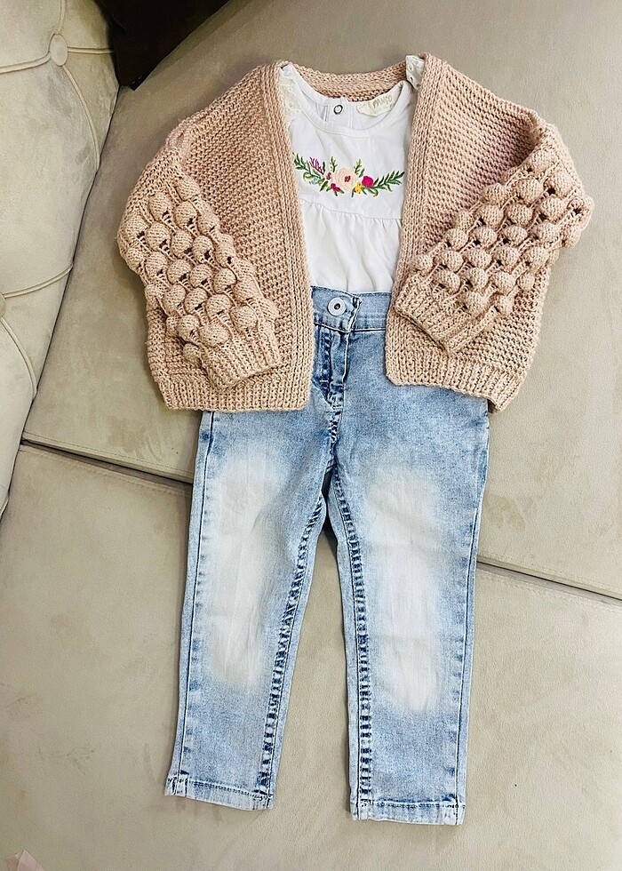 Hırka el örgüsü, tshirt panço, pantolon missmilano ithal. Ürünlerin hepsi 2 yaşa uygun.