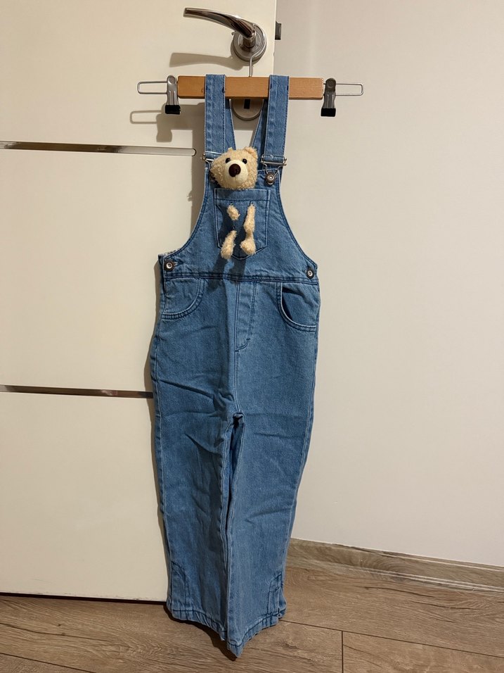 Askılı, tokalı, bol kesim mavi kot tulum. Ön cepte küçük oyuncak ayı detayıyla rahat ve gündelik tarzda kız çocuk tulumu.