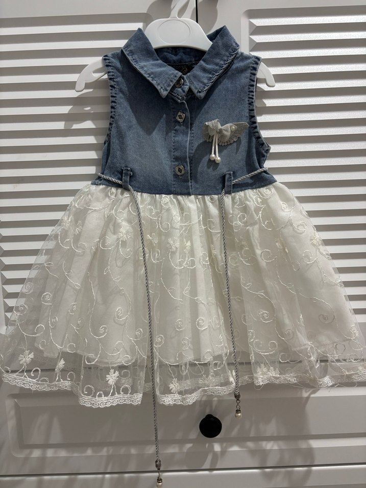 Kız çocuk kot kumaşından, yakalı ve kolsuz üst kısmı, nakışlı beyaz dantel etekli elbise. Fitted kesim, bohem tarz ve straplez görünüm sunar.