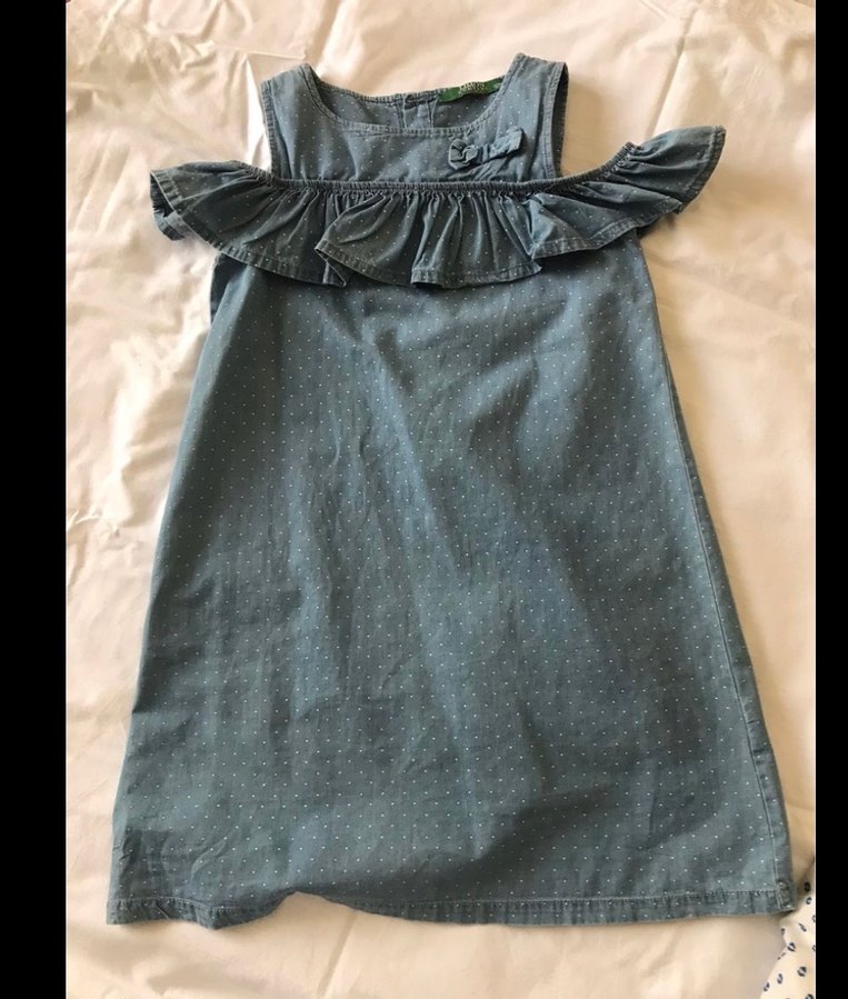 Mavi kot kumaştan, kolsuz ve bol kesimli kız çocuk elbisesi. Göğüs kısmında fırfırlı detay ve ince puantiyeli desen bulunur.