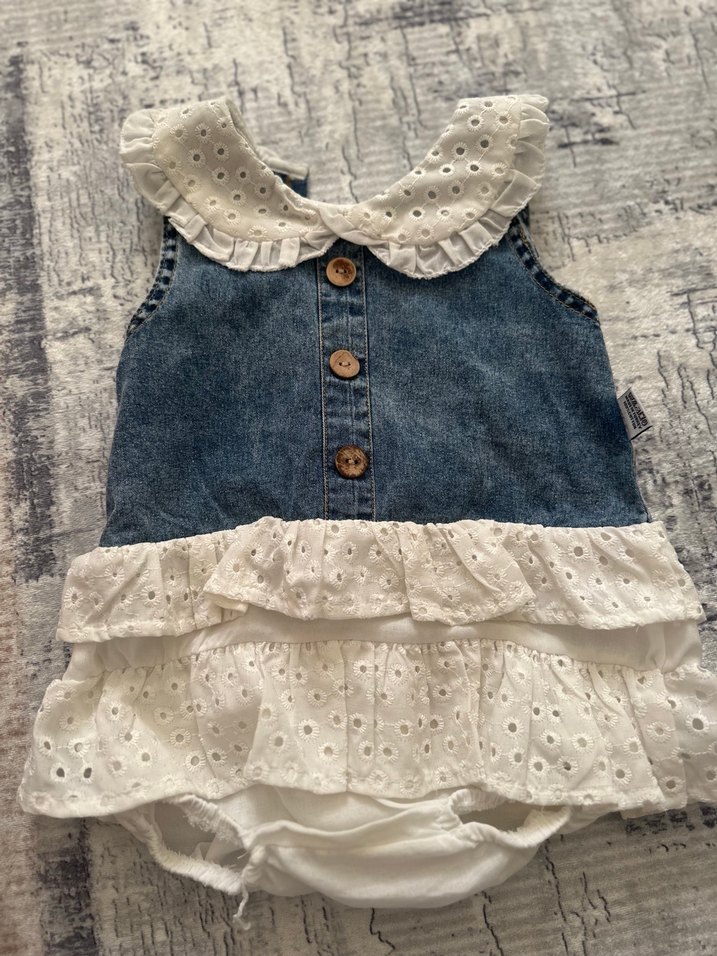 Kolsuz, fitted kesim kız çocuk elbisesi. Kot üst kısmı, ahşap düğmeler ve beyaz işlemeli fırfırlı etek ile bohem tarzda.