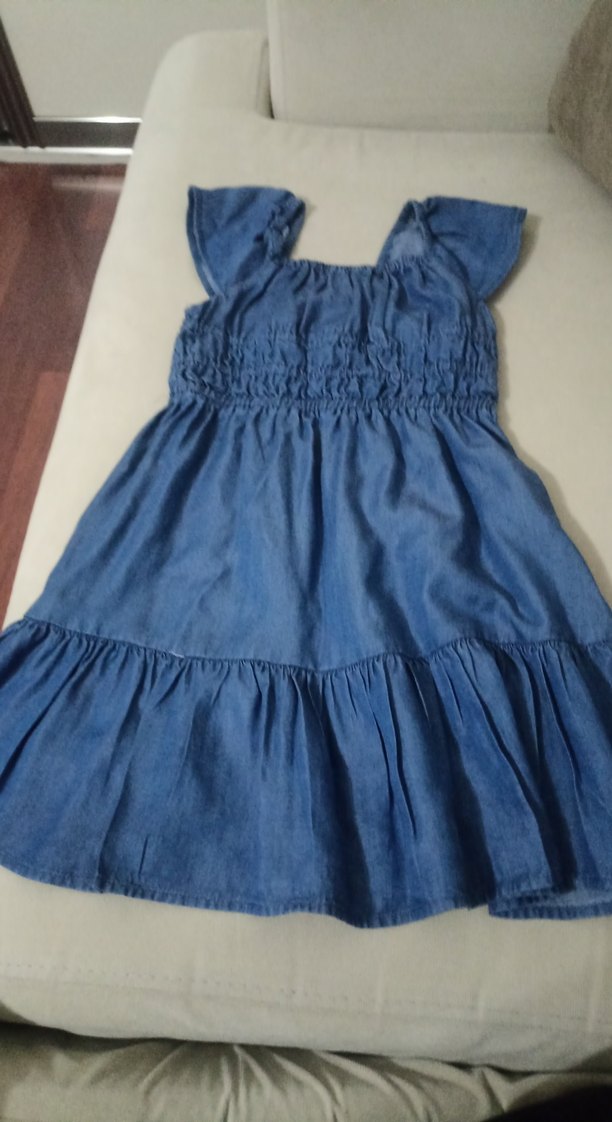 Kolsuz, straplez yaka ve bol kesim kız çocuk kot elbise. Yumuşak kot kumaştan, volan detaylı ve parlak mavi renkte, bohem tarzda.